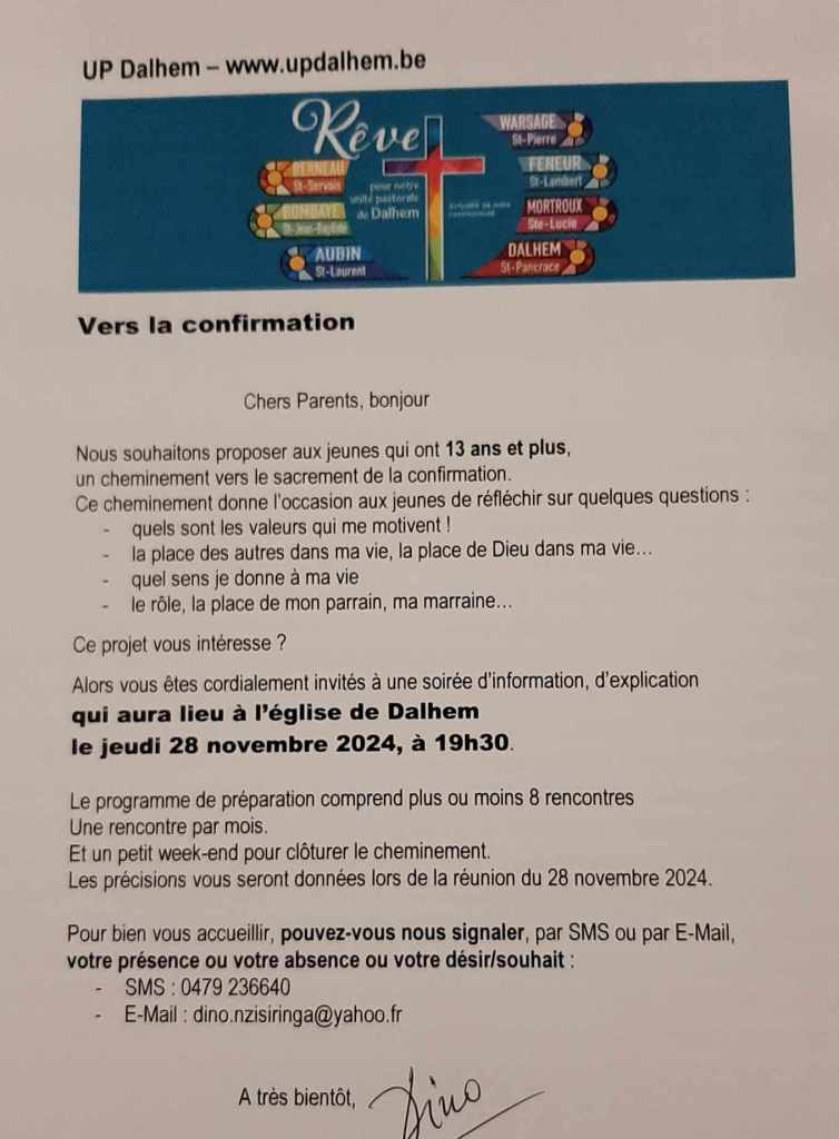 Vers la confirmation – inscription Publié le 19 novembre 2024 par dinonz Jeudi 28.11, 19h30, église de Dalhem: rencontre/inscription en vue de la confirmation Partagez si vous aimez ! Cliquer pour imprimer(ouvre dans une nouvelle fenêtre) Imprimer Cliquer pour envoyer un lien par e-mail à un ami(ouvre dans une nouvelle fenêtre) E-mail Cliquez pour partager sur Facebook(ouvre dans une nouvelle fenêtre) Facebook Cliquer pour partager sur X(ouvre dans une nouvelle fenêtre) X Cliquez pour partager sur WhatsApp(ouvre dans une nouvelle fenêtre) WhatsApp J’aime chargement… Similaire