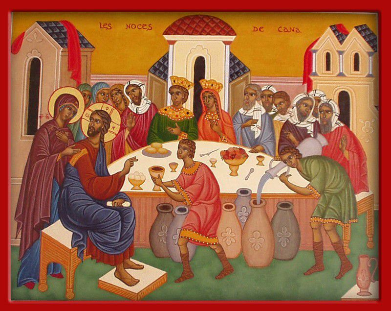 On peut tour à tour s’identifier aux différents personnages du récit : Jésus intervenant pour que la joie coule à flots ; Marie attentive aux failles du banquet ; les disciples invités de raccroc et témoins ébahis ; et finalement nos discrets serviteurs qui font confiance à Marie et exécutent l’étrange manipulation prescrite par Jésus.
