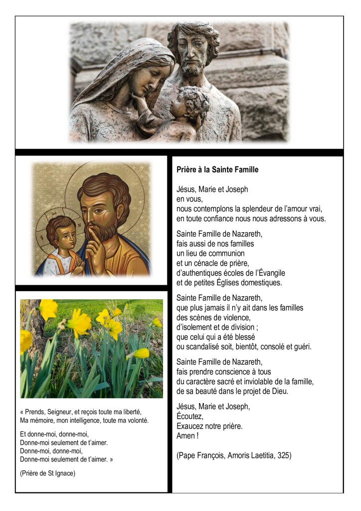 Joseph, le saint patron de nos familles Publié le 5 mars 2026 par dinonz « Jésus, Marie, Joseph, en vous, nous contemplons la splendeur de l’amour vrai… » Partagez si vous aimez ! Imprimer(ouvre dans une nouvelle fenêtre) Imprimer Envoyer un lien par e-mail à un ami(ouvre dans une nouvelle fenêtre) E-mail Partager sur Facebook(ouvre dans une nouvelle fenêtre) Facebook Partager sur X(ouvre dans une nouvelle fenêtre) X Partager sur WhatsApp(ouvre dans une nouvelle fenêtre) WhatsApp J’aime chargement… Similaire