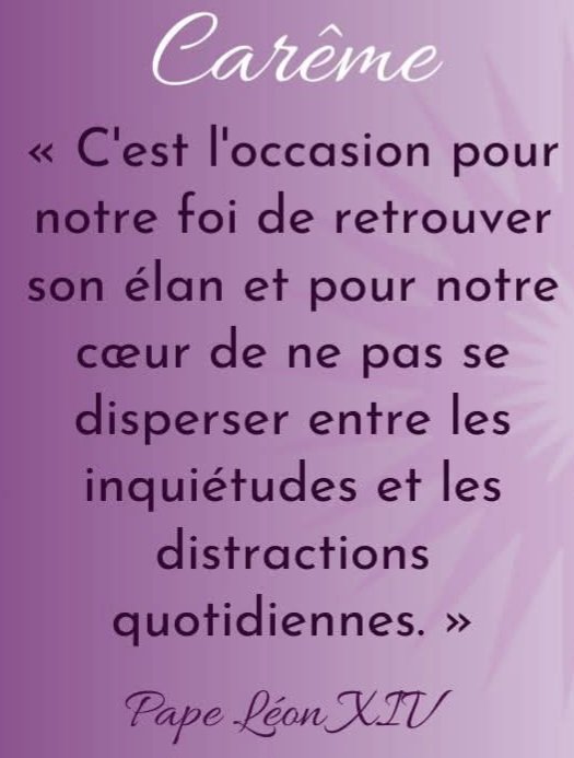 « Seigneur, en union avec tous les chrétiens du monde, je te remercie pour ce carême. Tu me connais, tu sais qu’il me faut du temps pour mieux ouvrir mon coeur à ta parole. Que ces quarante jours me permettent de te connaître un peu plus. Que ton Esprit demeure en moi pour me guider et me conseiller. Alors le jour de Pâques, la joie sera grande de fêter ta résurrection. »