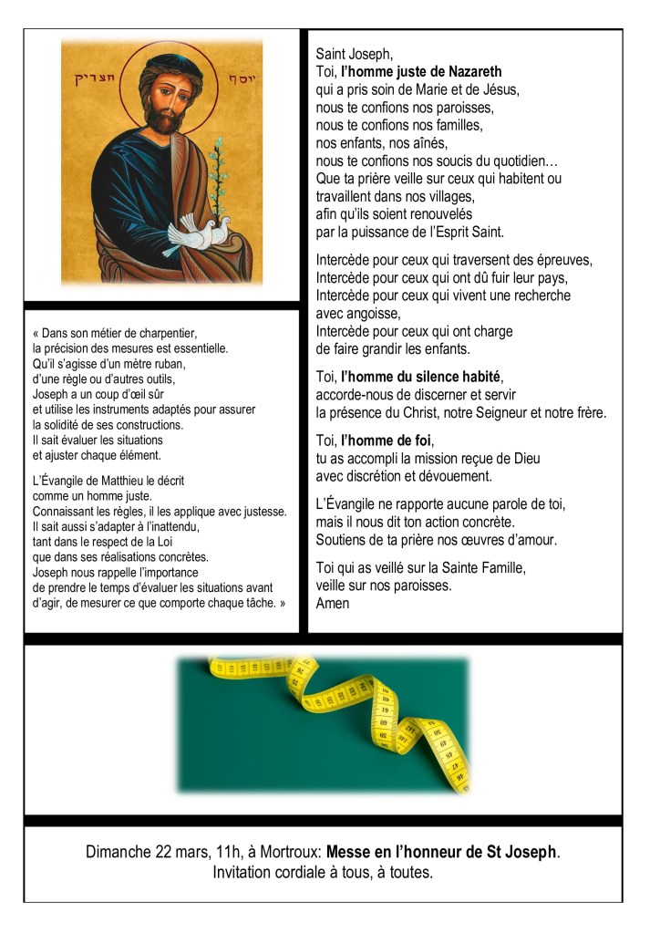 Dimanche 22 mars, 11h, à Mortroux: Messe en l’honneur de St Joseph. Invitation cordiale à tous, à toutes.